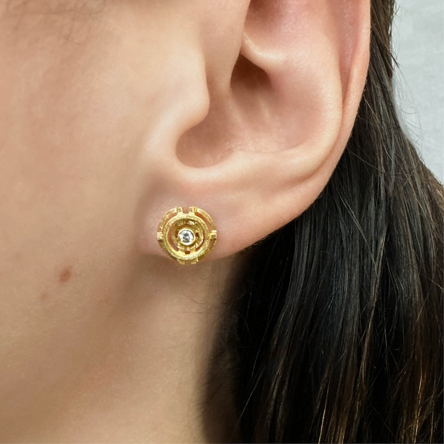 The hand-drawn 18ct gold wires encircle the 0.15ct recycled diamonds. Each circular wire is heavily textured with a satin finish to compliment the sparkling central diamonds.