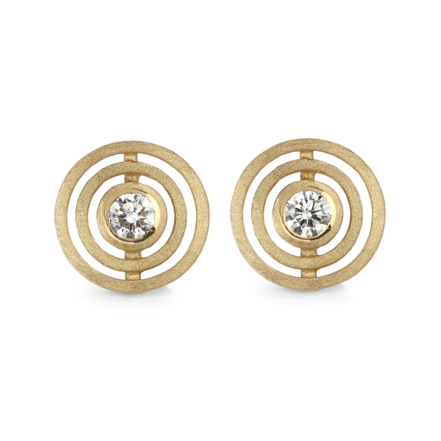 The hand-drawn 18ct gold wires encircle the 0.15ct recycled diamonds. Each circular wire is heavily textured with a satin finish to compliment the sparkling central diamonds.