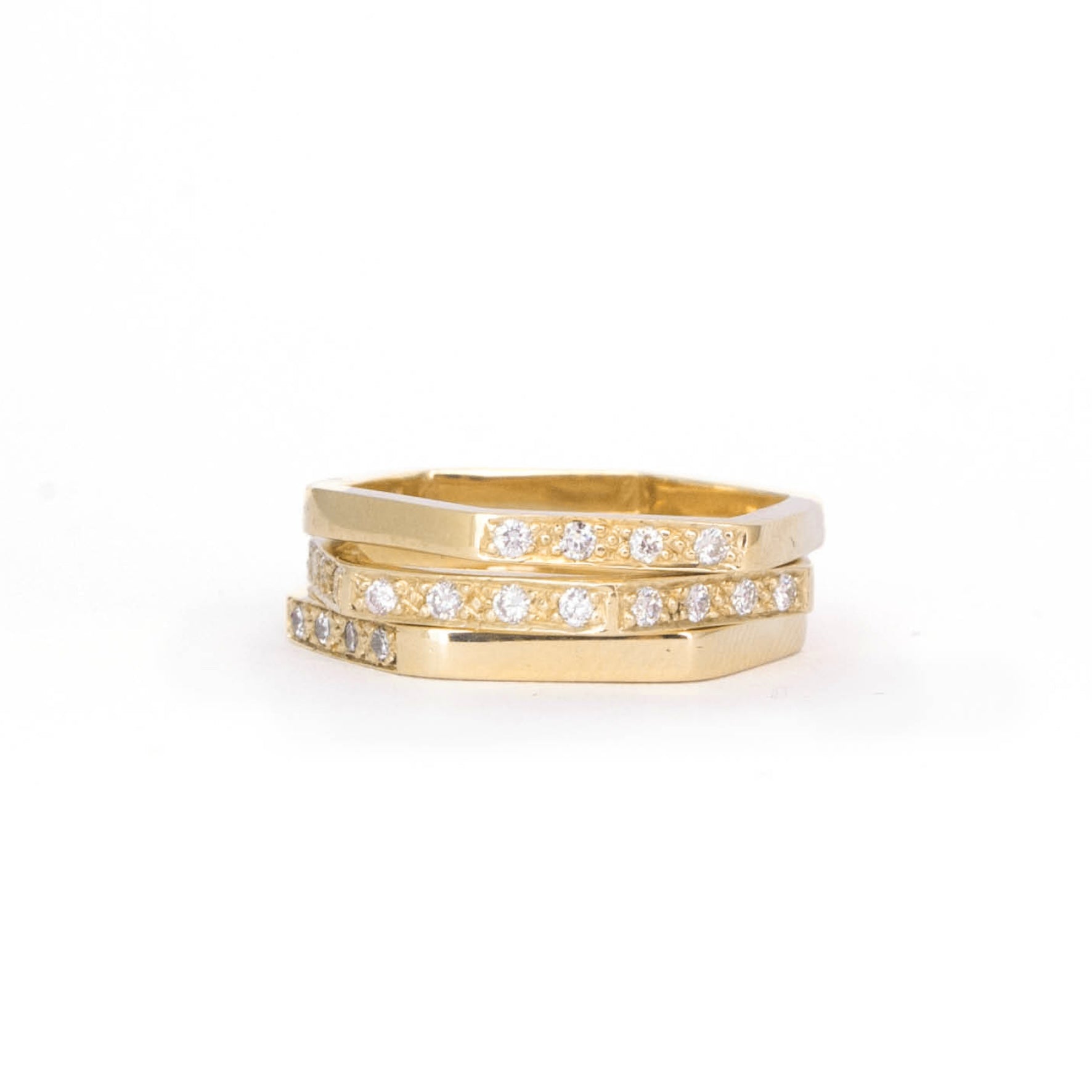 Pave set diamonds adorn the sides of these hexagon shaped rings.