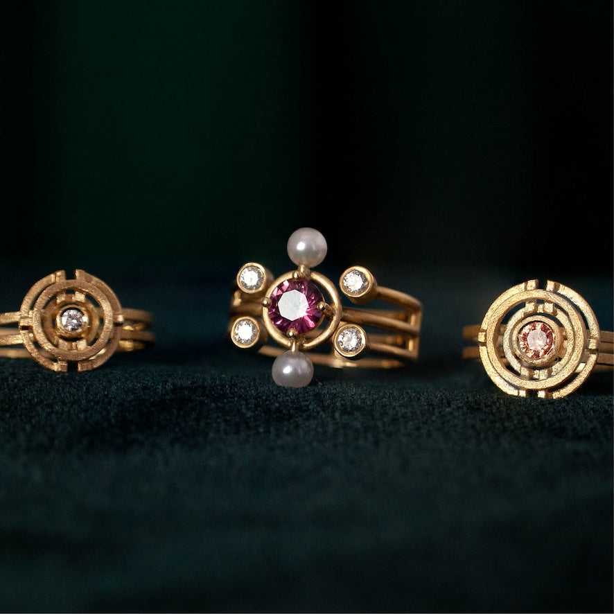 Hand-drawn 18ct gold wires encircles a 3.7mm peach sapphire. Each circular wire is heavily textured with a satin finish.